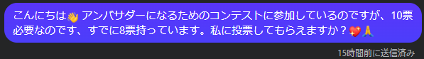 すると、数分後に何のアンバサダーなのかの回答もなく、あと2票だけ足りないから何とかお願いしたいと言うようなメッセージが返って来ました。